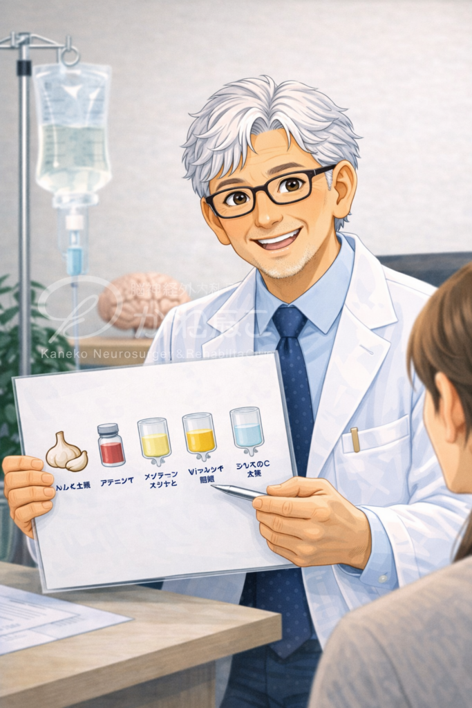 かねこ脳神経外科リハビリクリニックでは、自費診療としてにんにく注射、プラセンタ注射のほか各種点滴療法を行っています。
