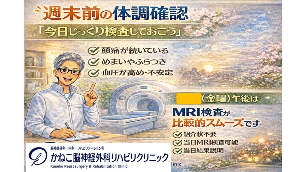 寒暖差や気圧変化、花粉などの影響で体調が不安定になる時期ですが、念のためMRIで脳の状態を確認しておくことで安心につながる場合があります。